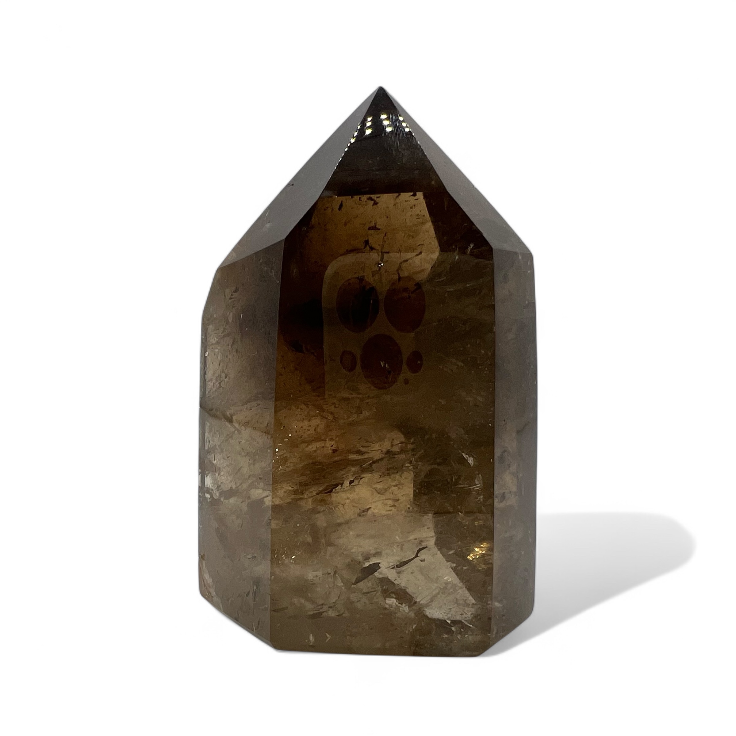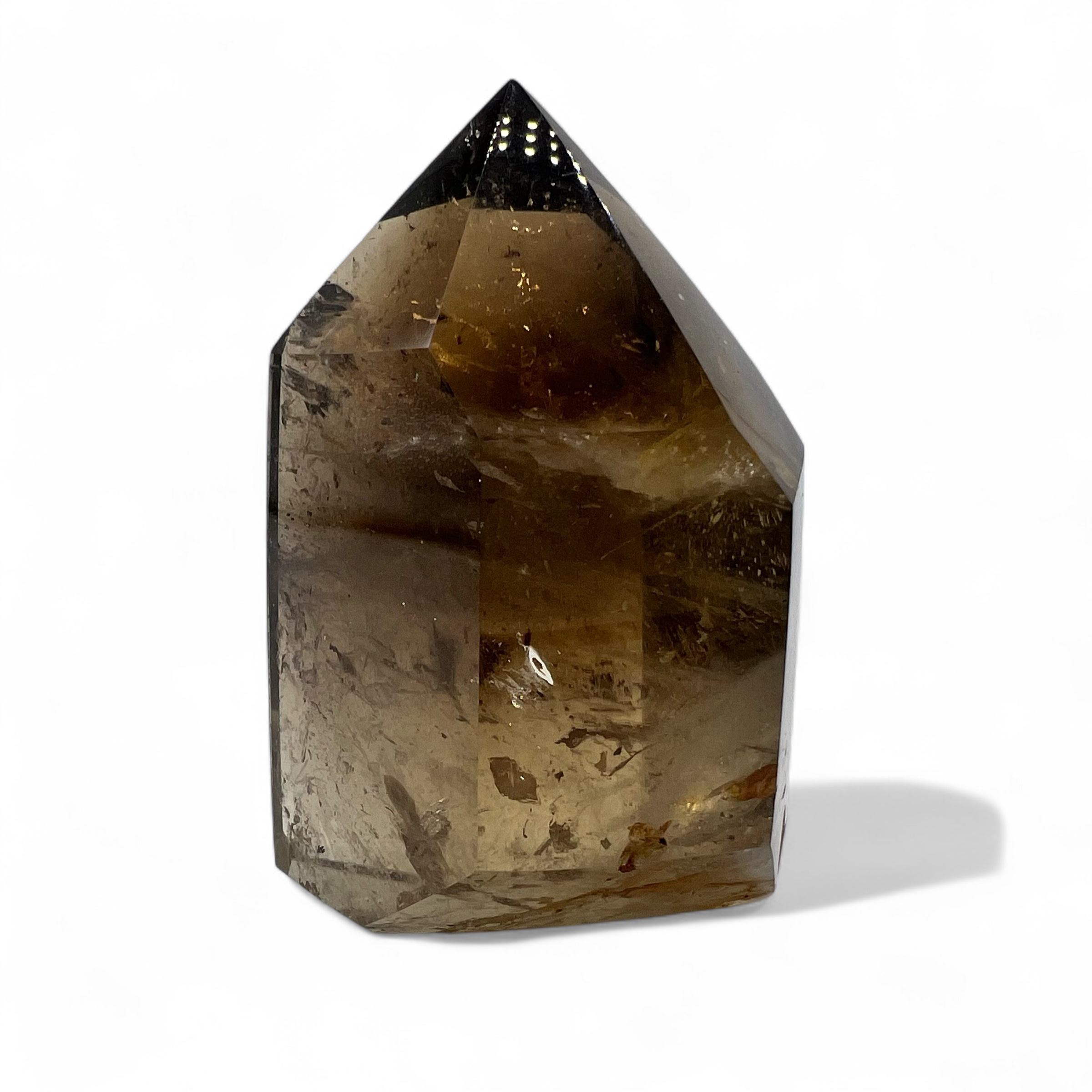 This master crystal comes from the Quartz family and gets its name from the magnificent smokey minerals which run through it, colouring this crystal with shades of deep brown and black. It is a powerful worker, drawing negative energy like a sponge, consistently mopping up all of our excess. One to be regularly cleansed and recharged so it’s able to continue to draw out heavy dark energy. This point has amazing inclusions and a beautiful rainbow.